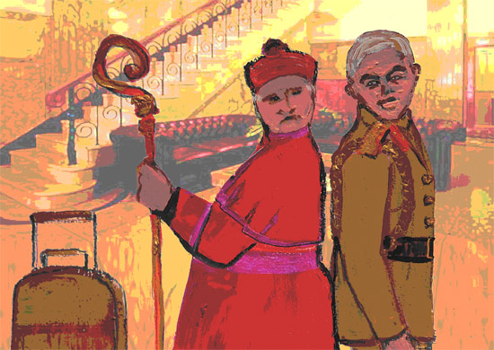 I often struggle with figures, but Jock’s words provided a clear image of the rotund and sharp-tongued bishop and his quick-witted former class mate. The figures and accessories were painted in acrylic then taken into PhotoShop and superimposed on a photograph of a hotel lobby.