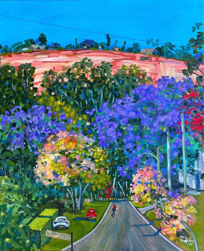 I love my street at any time of year, but in November when the jacarandas and Christmas bushes are out, it’s spectacular – especially when the sun lights up the quarry face.