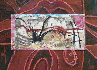Travelling through the Gulf Country in north Queensland , I found the corrugated roads were making the wet paint pool and run interestingly, so I scooped up handfuls of earth to mix with watery acrylics and loved the result. This image can be interpreted in many ways, perhaps this is the natural function of end papers?IN PRIVATE COLLECTION