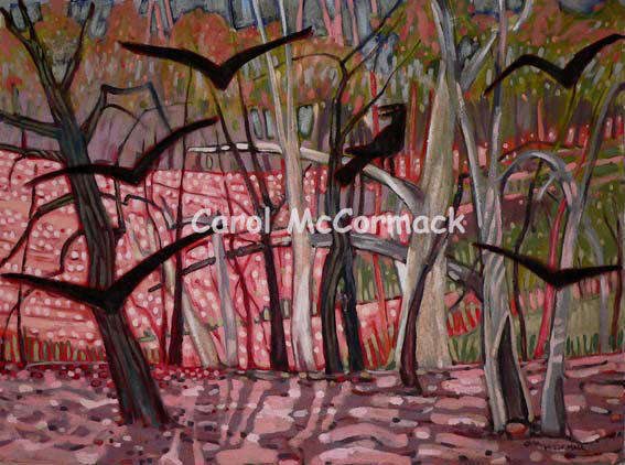 Here the creek bed is deeper, cutting a steep wall through the gravel banks and disappearing from view. Crows meet here. 1988