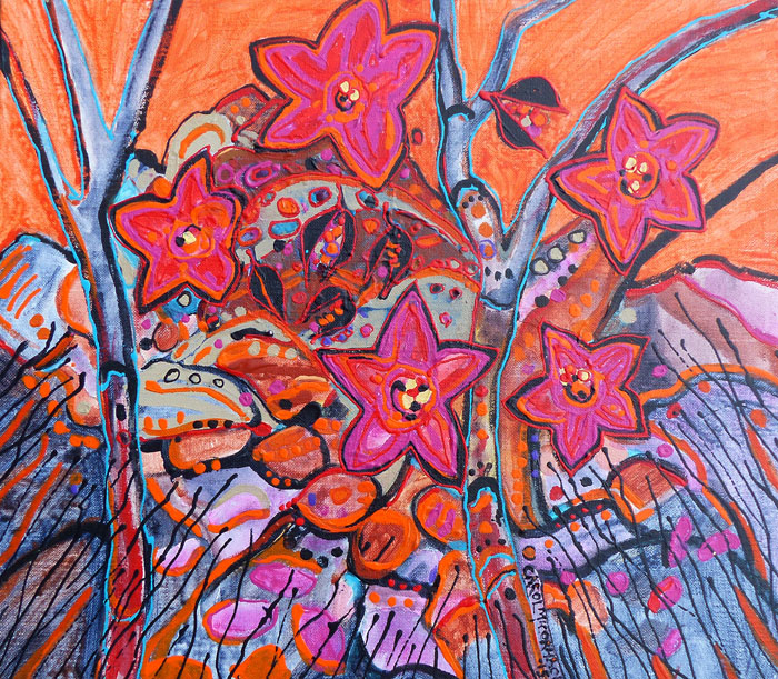 I never tire of painting the beautiful flowers of the Kimberley Rose, a close relative of the Illawarra Flame Tree growing in my garden, as well as the Bottle Tree and the Kurrajong which are common throughout our area.