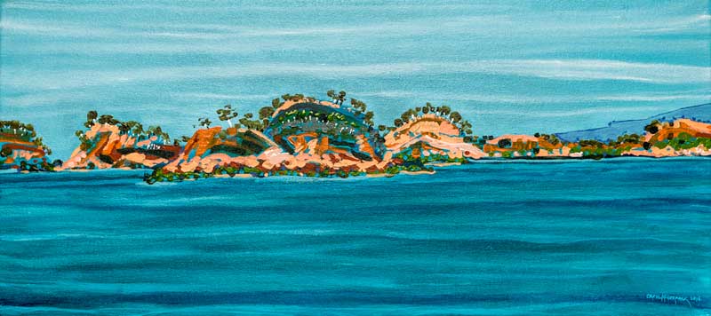 Painted on location in Collier Bay north of Derby WA. These uninhabited islands are typical of the coastline north of Cape Leveque and the jewel bright colours sparkled on this clear, still day. Everyone else went fishing, the boat was my studio!