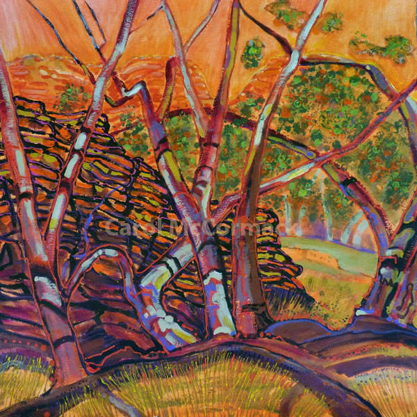 Ruby Gap shady camp This grassy ledge overlooking the Hale River was my camp for a couple of mornings while working on the spectacular gorge scenery. There’s a peaceful feeling as if this place has sheltered campers for centuries – the traditional owners, the miners, today’s nomads, artists.