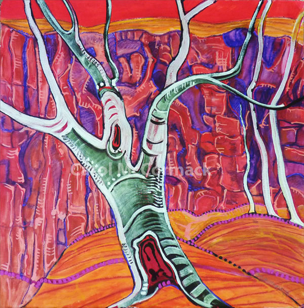 Glen Helen spicks and specks In Aboriginal tradition, plants and landforms were spirit beings created at the dawn of time, and their power still exists in the landscape they created. Beyond the ancient eucalypts is the steep wall of Glen Helen Gorge sculpted from four or five million-year-old orange-yellow pacoota sandstone. I am a newcomer, and feel very small.