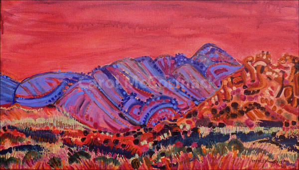 Over Ormiston way We saw Ormiston Gorge on the ground and from the air – no time to paint, so I made do with sunset views of the range surrounding Ormiston Pound from our Finke River camp near Mt Sonder.