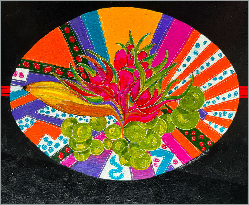 I loved Libby's work and was a good customer. This plate belongs to a friend and she knows how to decorate it! The impasto drawings surrounding the plate are based on the design of a set of table mats also by Libby.