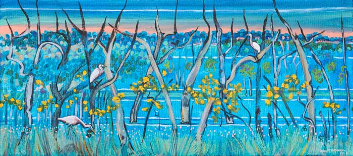 Morning in the wetlands, Kookaburras shouting, pink tinging the far bank and tops of trees
