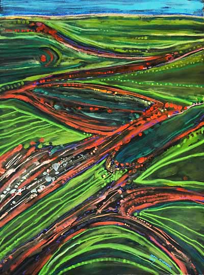 Coming in to land at Nhulunbuy – red red earth, blue blue sea and green green land. This is the first of the Arnhem Land series which will all be painted from memories, photos and small sketches as (unusually) we travelled by plane and bus.
