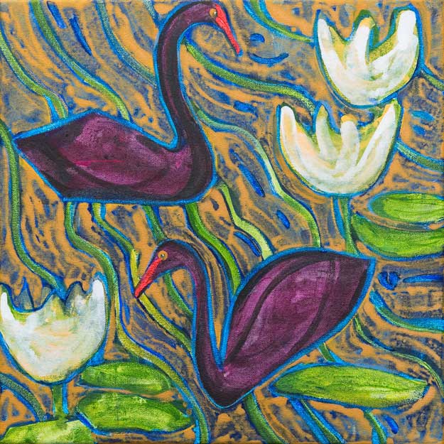 In a hurry to get home as usual, we left early after an overnight camp at Lake Houdraman (Quilpie). With swans and waterlilies swimming in my brain I dashed off the undercoat for this one as we drove and finished it much later.