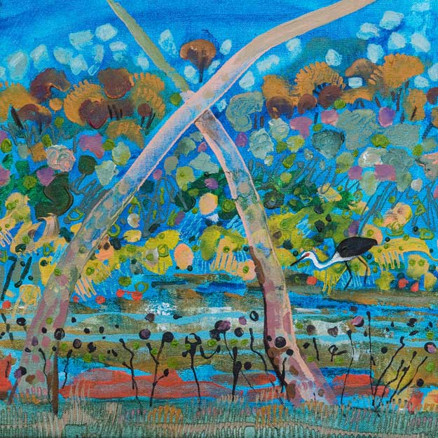 As we head homeward from the north or west I’m always conscious of the colour changes. Even when the country is dry, our southern wintry weather makes for much more blue on the palette. This one was helped by the wet weather, painted between Tambo and Augathella. My pencilled notes say it all – “and this was just the table drain!
